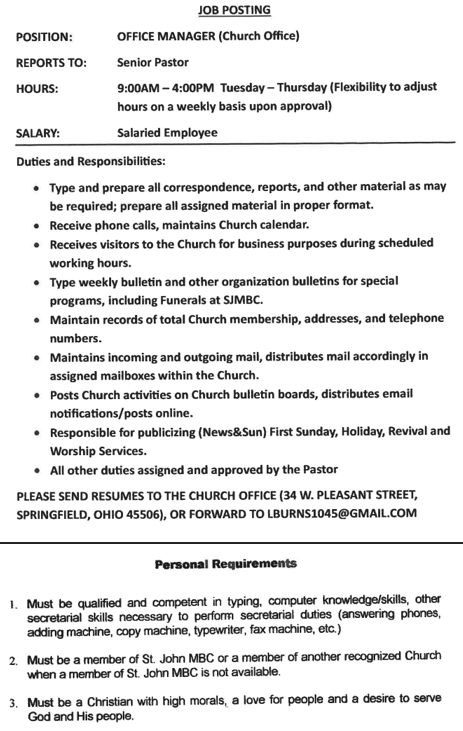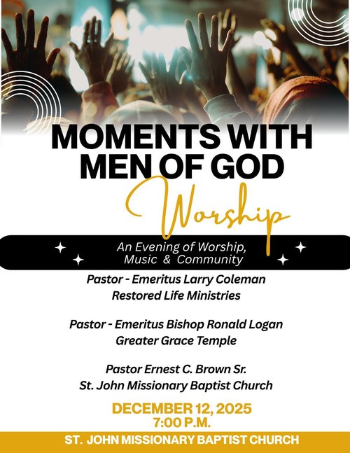 The vision of St. John Missionary Baptist Church is to glorify God by providing discipleship, caring, and nurturing, healing and support through the gospel of Jesus Christ, to those in Clark County, Miami Valley, and extended community. Through a total investment in God's people, we strive to create a dynamic and vibrant family life experience through spirit filled and celebrative worship, fellowship, discipleship, outreach and service.